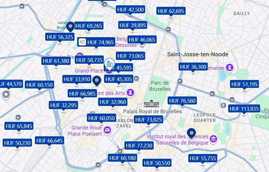 A szállásárak Brüsszelben különleges mintázatot mutatnak: hétköznap (kedd-csütörtök) drágábbak az EU-s üzleti utazók miatt, míg hétvégén olcsóbbak. Két főre, egy hétre számítva: