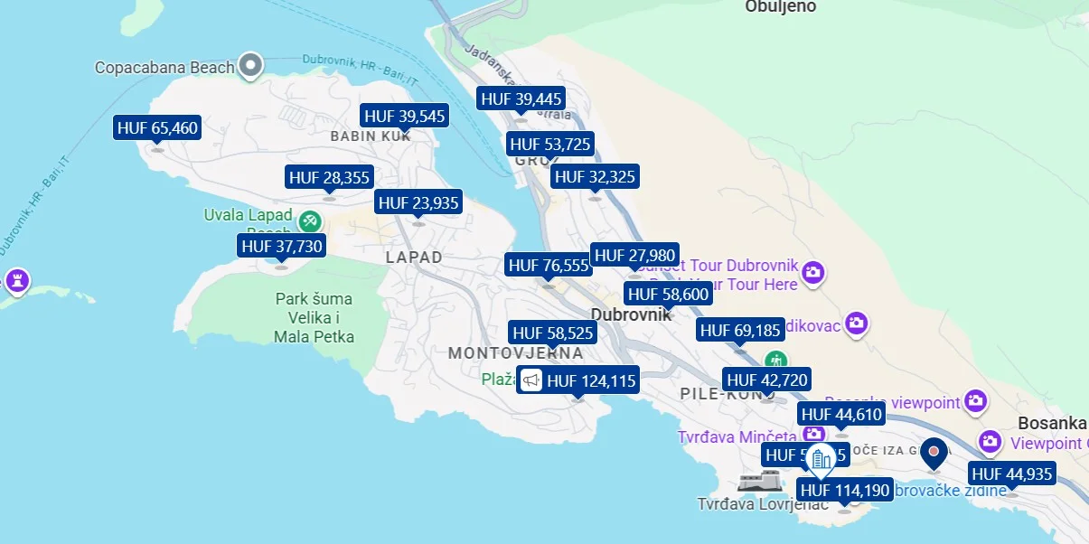 A térképen azt nézhetjük meg, hogy ha most foglalnánk, a kiválasztott dátumon mennyibe kerülne a szállásunk: