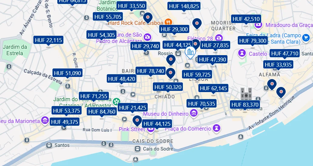 A térképen azt nézhetjük meg, hogy ha most foglalnánk, a kiválasztott dátumon mennyibe kerülne a lisszaboni szállásunk:
